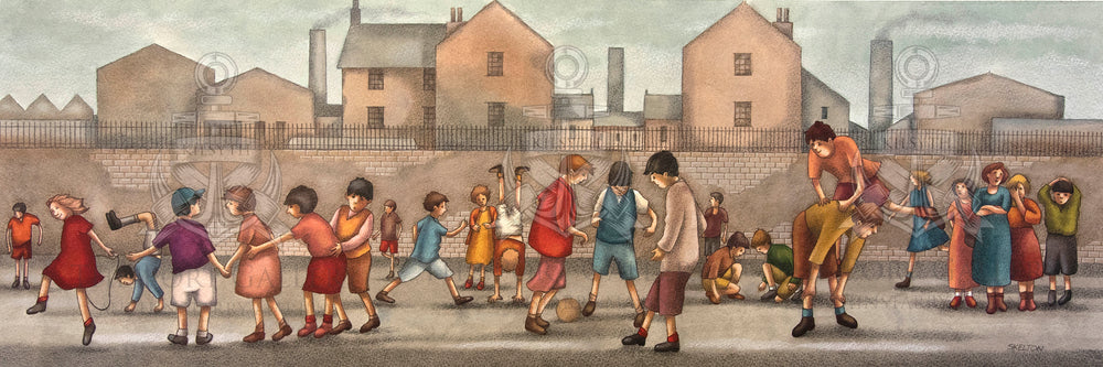 Sam Skelton is a Scottish artist whose evocative paintings capture the quiet poetry of everyday life. His distinctive style blends nostalgic imagery with moody, atmospheric light — scenes of figures beneath brooding skies, children playing against industrial skylines, and moments of stillness in familiar streets.